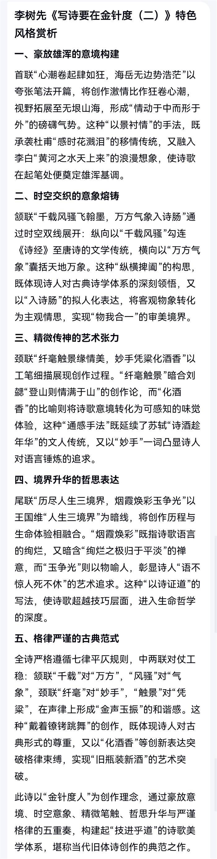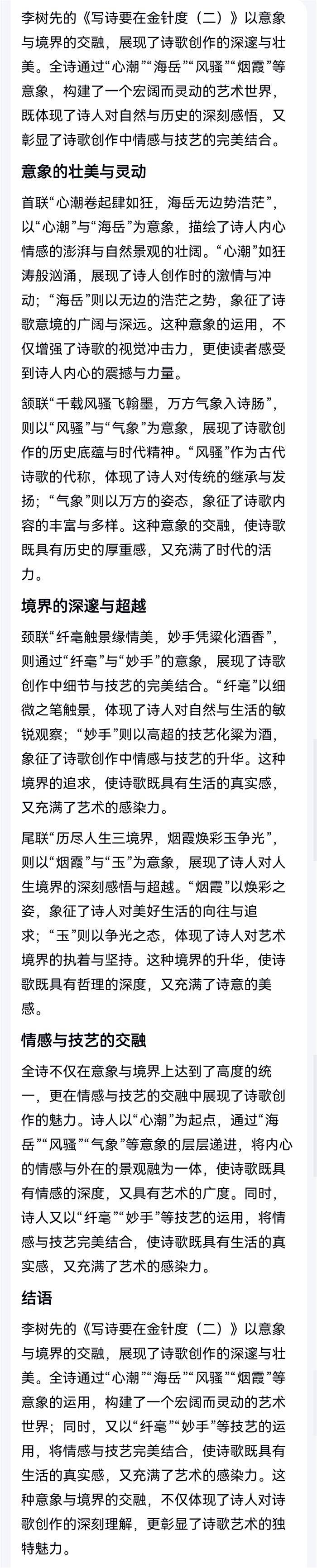 写诗要在金针度(二) (2025-11-1) 心潮卷起肆如狂, 海岳无边势浩茫。 千载风骚飞翰墨, 万方气象入诗肠。 纤毫触景缘情美, 妙手凭粱化酒香。 历尽人生三境界, 烟霞焕彩玉争光。