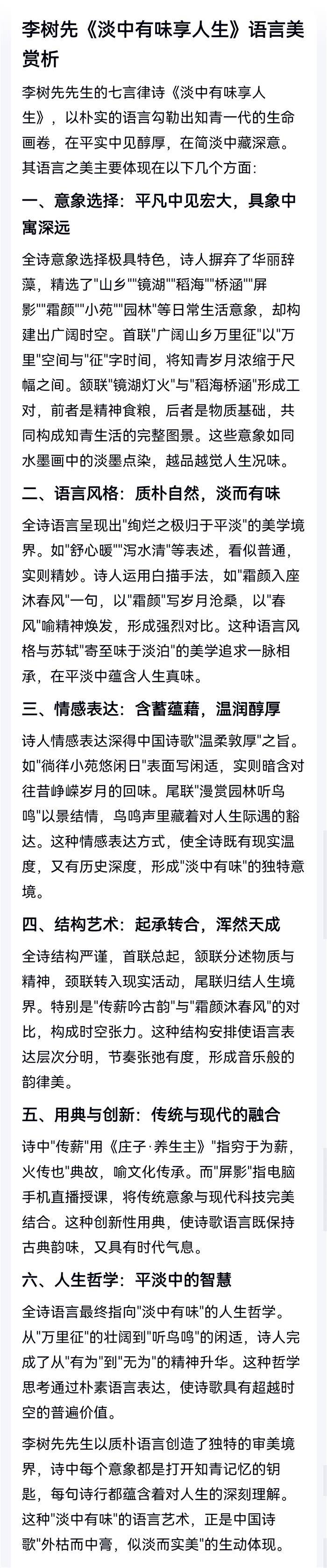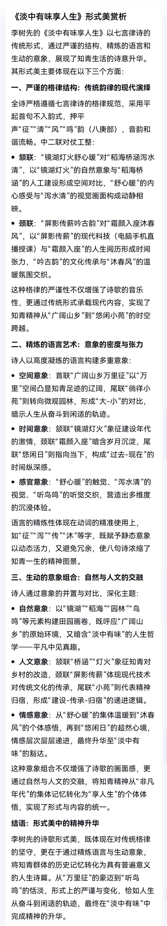 淡中有味享人生(2025-12-31)广阔山乡万里征,非凡年代老知青。镜湖灯火舒心暖,稻海桥涵泻水清。屏影传薪吟古韵,霜颜入座沐春风。徜徉小苑悠闲日,漫赏园林听鸟鸣。 注:首联,一代知青,万里山乡。颔联,镜湖建电站,灯火暖心。稻乡建桥涵,水利稻丰。颈联,传薪古韵十八载,诗友霜颜沐春风。屏影,此指电脑手机屏前直播授课。尾联,徜徉小苑,漫赏鸟鸣。 Al赏析二则