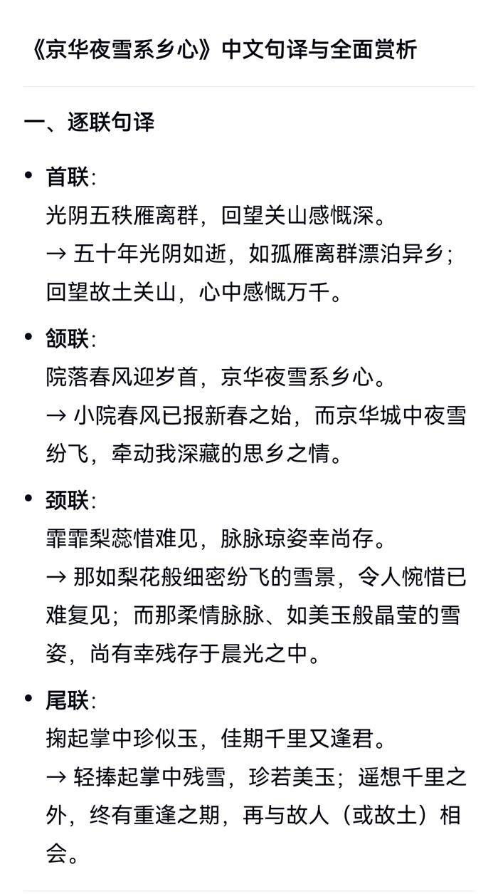 注:居京人春节思故乡。首联,五秩离乡,佳节思亲。颔联,春迎岁首,雪系乡心。颈联,雪夜下时未醒,晨游幸见残存。尾联,掬掌珍似玉,千里又逢君。