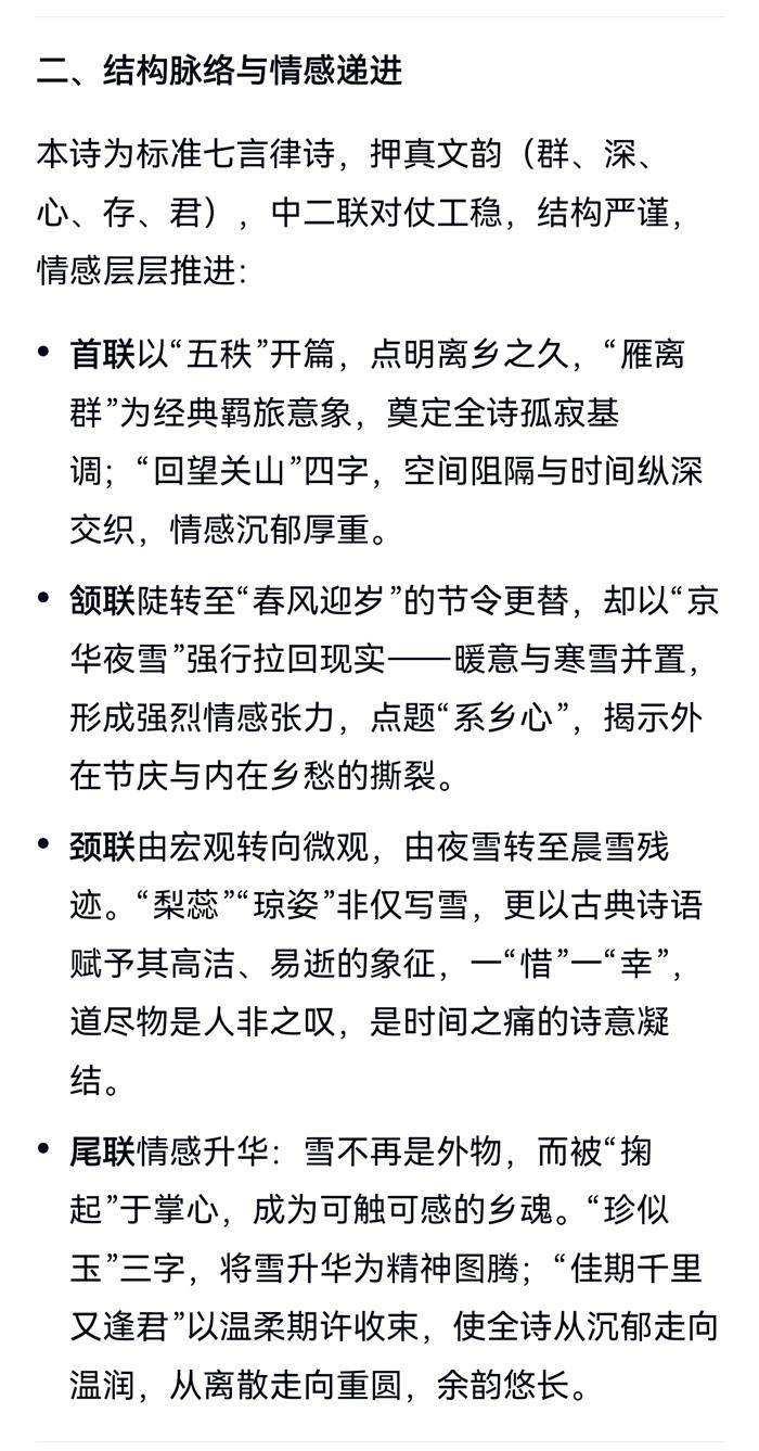 京华夜雪系乡心。