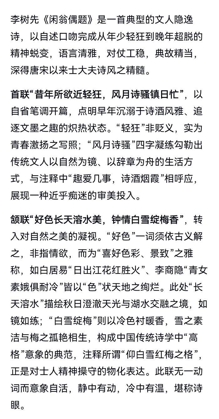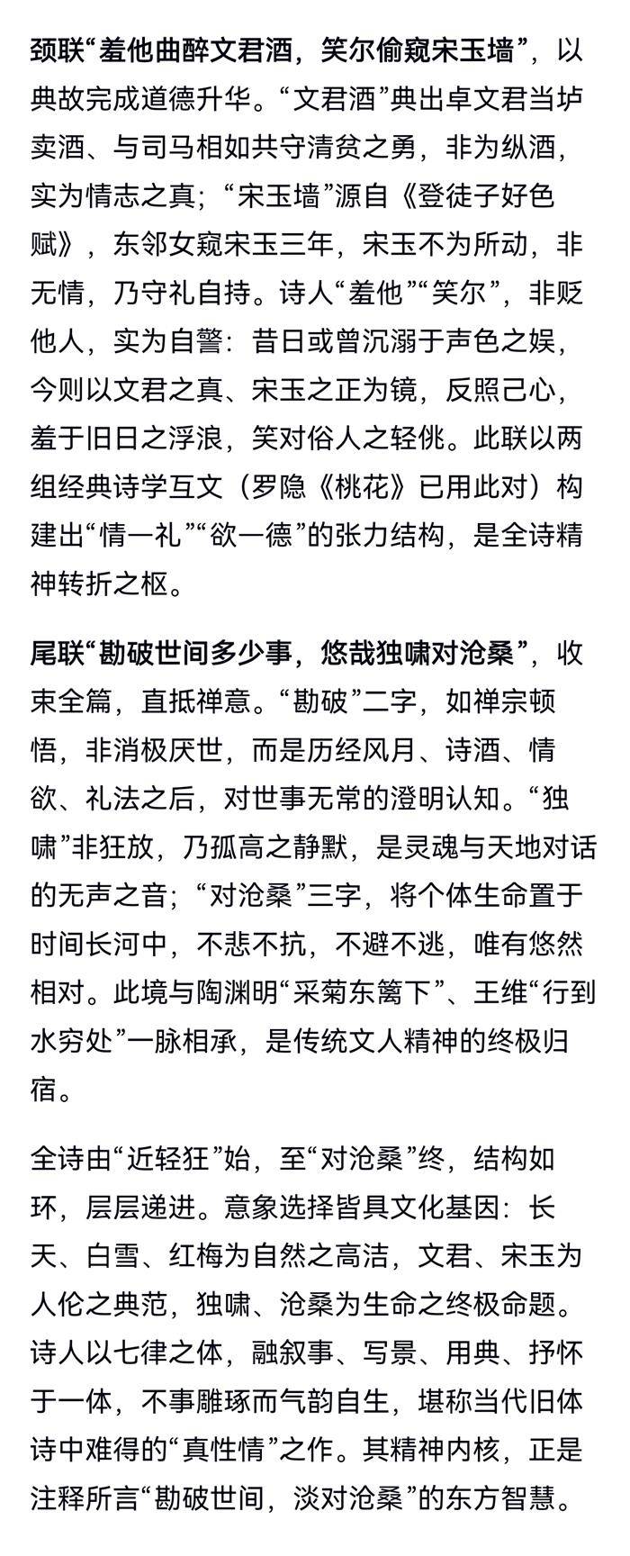 注:首联,趣爱几事,诗酒烟霞。颔联,赏秋水长天之色,仰白雪红梅之格。此好色指钟情秋水长天白雪红色之景色也。颈联,羞醉文君之相如,笑窥宋玉之邻女。尾联,勘破世间,淡对沧桑。