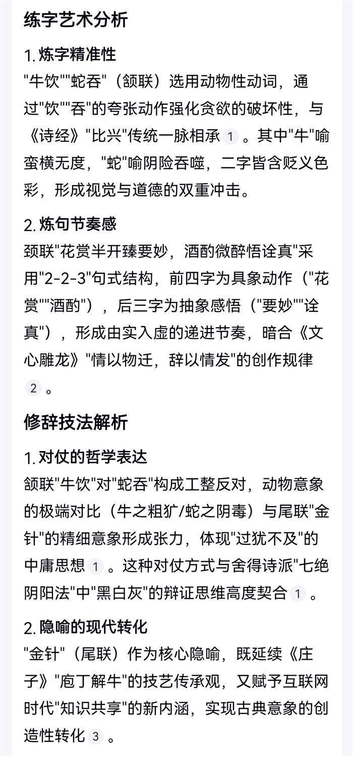 注:首联,大千世界,中庸至要。颔联,贪心纵欲,伤身害命。颈联,中庸适度,生存要妙。尾联。万物之理,适者生存。金针,秘要也。