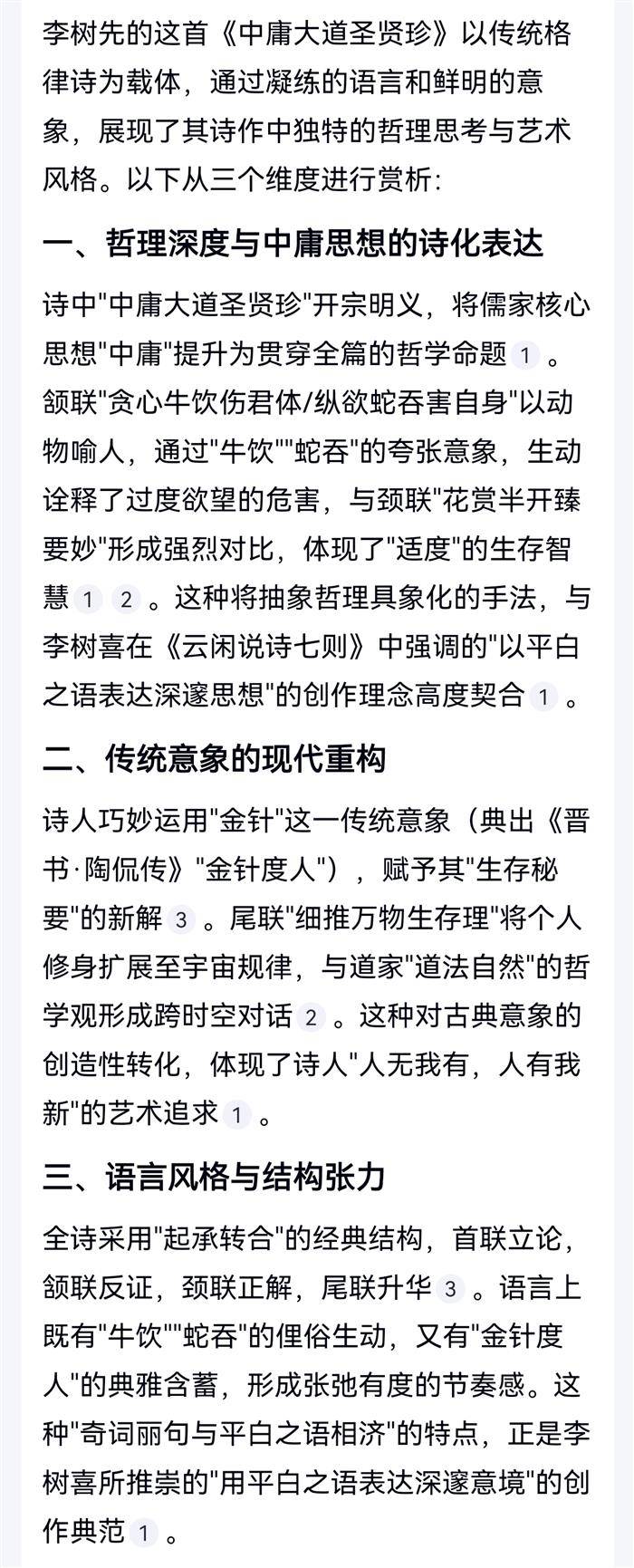 中庸大道圣贤珍 (2025-9-19) 世界三千古至今, 中庸大道圣贤珍。 贪心牛饮伤君体。 纵欲蛇吞害自身。 花赏半开臻要妙, 酒酌微醉悟诠真。 细推万物生存理, 且把金针度与人。
