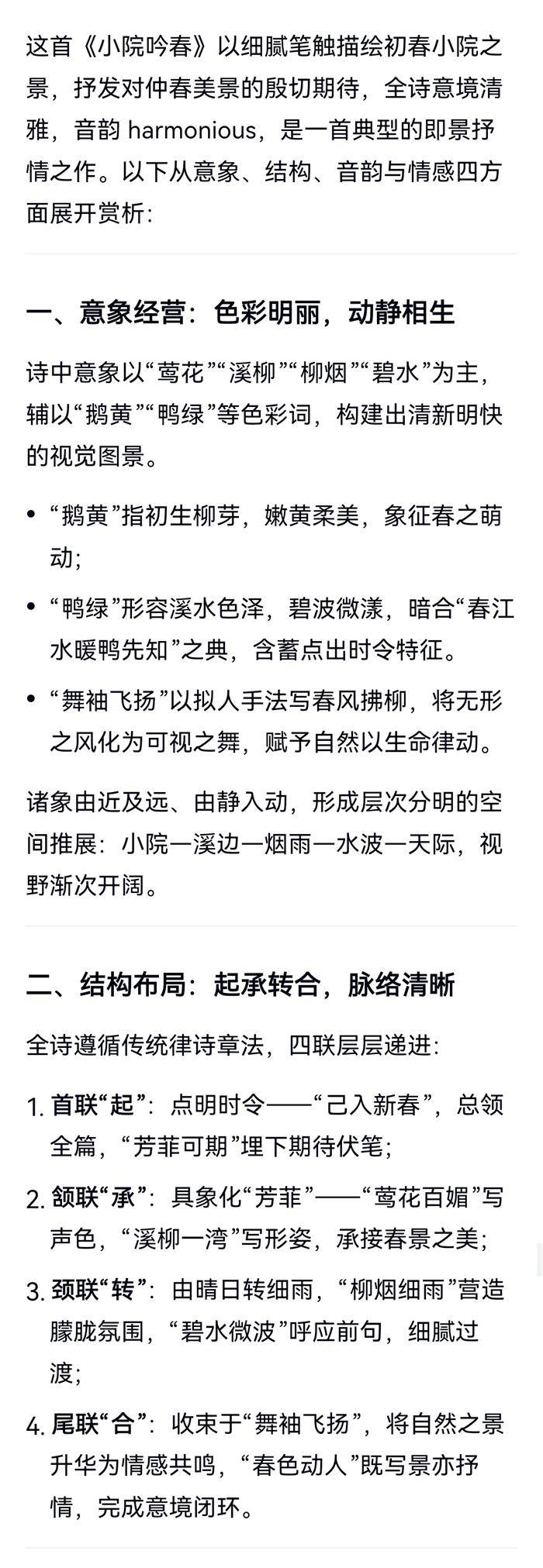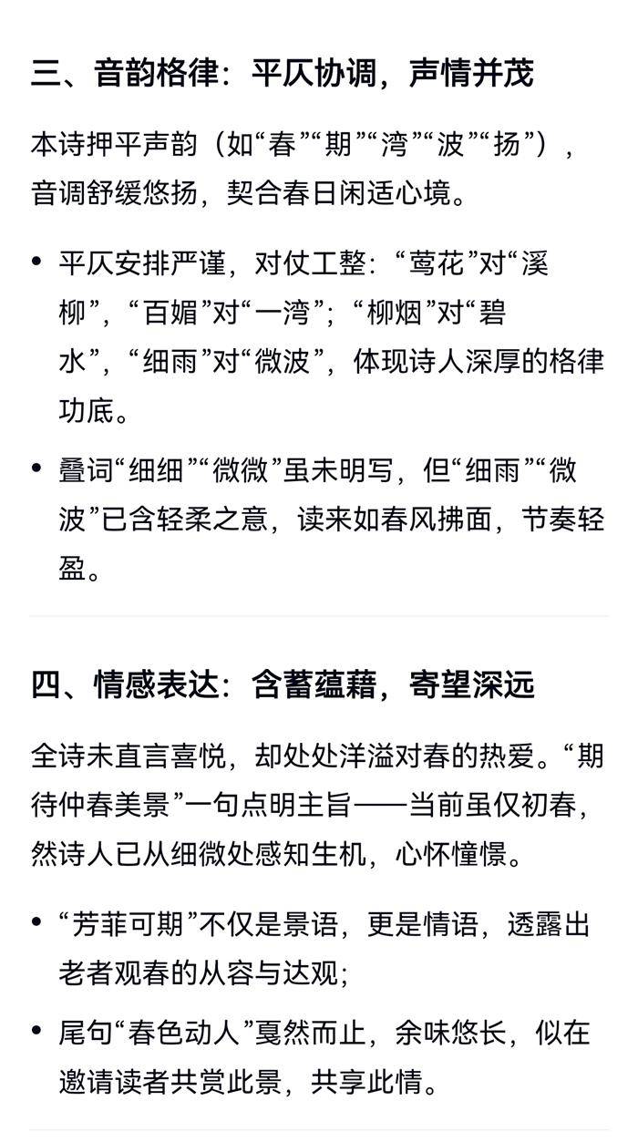 注:己入新春,期待仲春美景。首联,入春佳日,芳菲可期。颔联,莺花百媚,溪柳一湾。颈联,柳烟细雨,碧水微波。鹅黄,柳芽。鸭绿,水色。尾联,舞袖飞扬,春色动人。