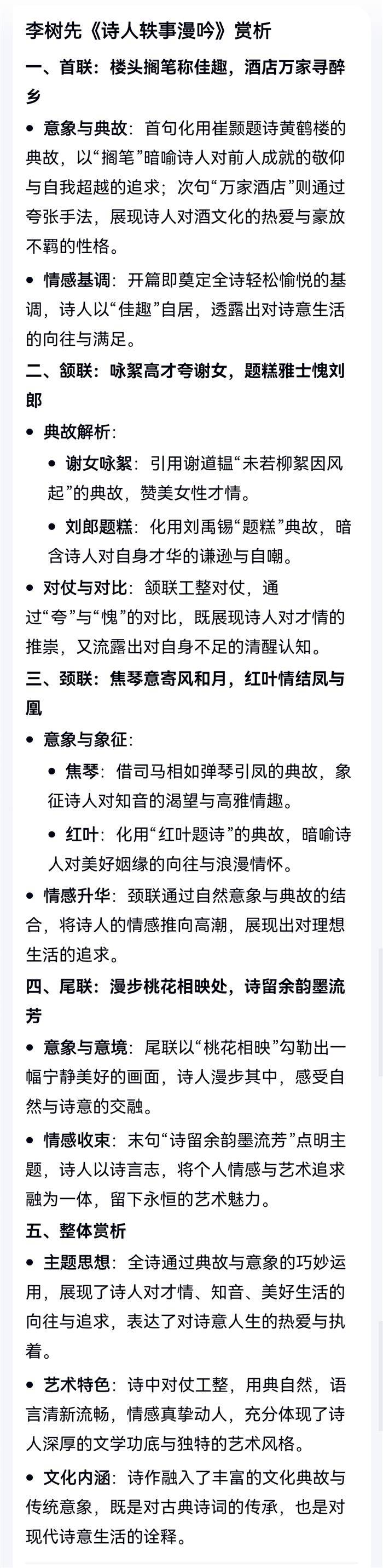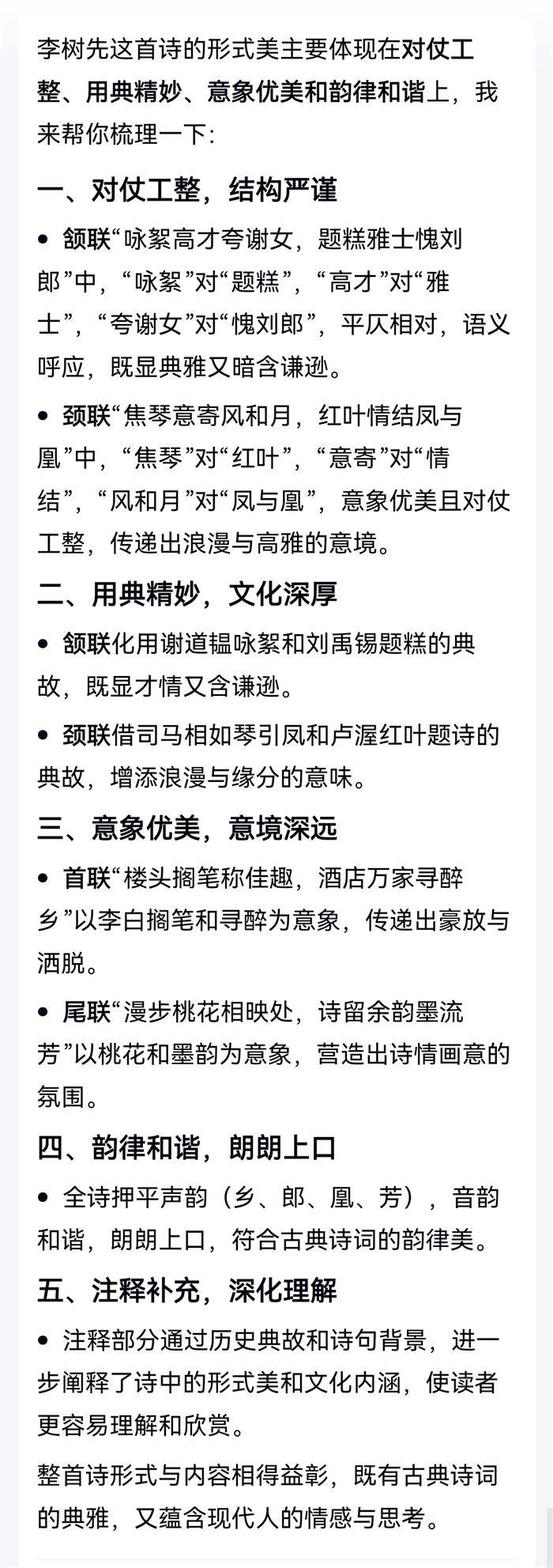 注:首联,黄鹤楼头李白搁笔,桃花潭水太白情深。颔联,谢家女咏絮,刘郎不敢题糕。颈联,汉司马相如弹琴引凤,唐人卢渥红叶题诗结缘。尾联,人面桃花,墨韵流芳。
