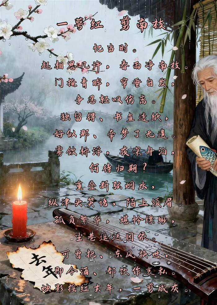 《词林正韵》忆当时。起相思几许,春雨净南枝。门掩青眸,帘垂白发,争忍轻叹伤离。独留得、书鱼透纸,好似那、牵梦了无遗。雾敛桥浮,夜深舟泊,何待归期?重叠断弦烟水,纵津头笑语,陌上须眉。孤负繁华,堪怜缥缈,尘巷遥送因依。可曾把、东风换世,即今酒、都饮作衷私。烛影摇红去年,一剪成灰。注:(起 纵)二字处宜用上一下四句式或领格句式,词中四字联、宜用对仗句式。