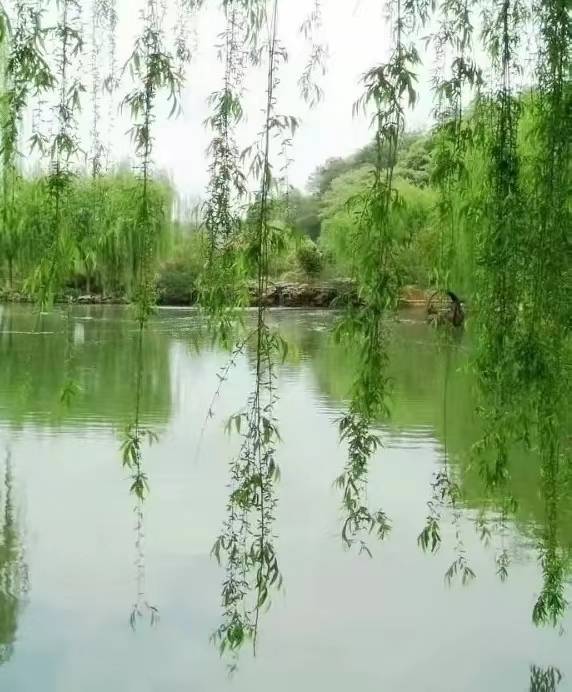 垂杨碧玉嫩枝条,紫气云飞两岸飘。