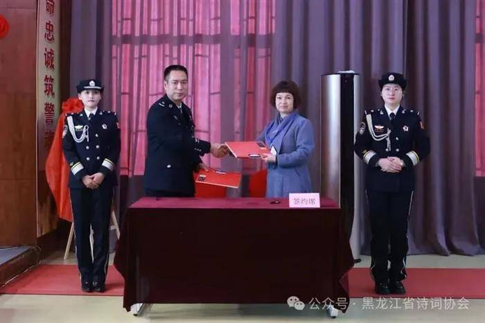 黑龙江省诗词协会会长胥春丽(右二)与黑龙江省绥化强制隔离戒毒所所长胡晓明(左二)为合作共建文化项目签约