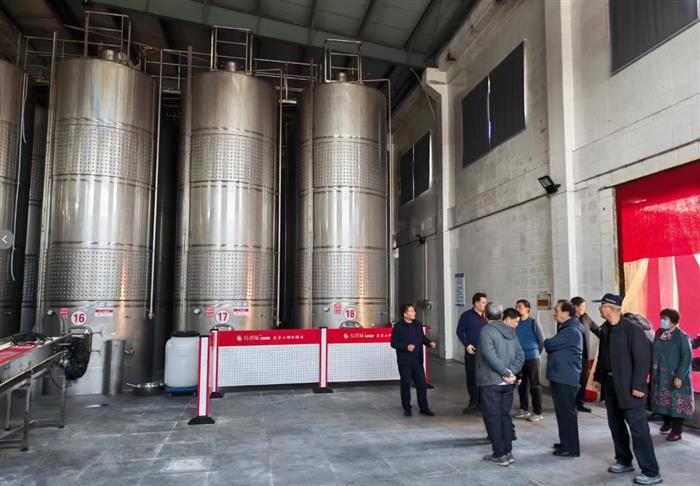 随后,大家走进发酵车间。空气中弥漫着浓郁的果香与酒香,一排排发酵罐整齐排列。邱董事长化身“讲解员”,从樱桃的选料、清洗,到发酵、陈酿,逐一细致讲解。“我们始终坚持传统固态发酵工艺,不加任何添加剂,一坛酒至少陈酿三年才能出厂。”