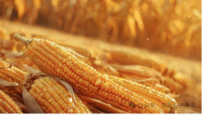 沃野金风秋意闹,玉米摇金,穗染阳光笑。铁马轰隆田亩扫,粮车列阵欢声绕。
