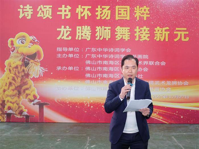 上午10时30分,活动在热烈祥和的氛围中拉开帷幕。南海区书法家协会党支部书记、老干部书画会会长温秀德担任主持。广东中华诗词学会副会长兼书画院院长吴彬,南海区文联副主席游远荣,黄飞鸿武术龙狮第六代传人黄钦添、第七代传人叶仲铭,广东中华诗词学会常务理事、书画院副院长罗国平,南海区书法家协会主席方孝坤,南海诗社社长冯全英等嘉宾,以及两地协会会员、文艺界同仁百余人共聚一堂,共迎新年。