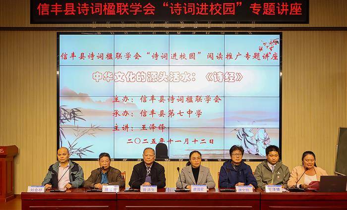 2025年11月12日下午,信丰县诗词楹联学会在信丰县第七中学阶梯教室成功举办了“诗词进校园”系列活动之《诗经》专题讲座。活动由学会骨干王泽锋老师主讲,信丰七中党总支副书记、校长唐雪花率领校领导班子成员及全体语文教师出席,与同学们共同聆听了一场跨越三千年的文化盛宴。