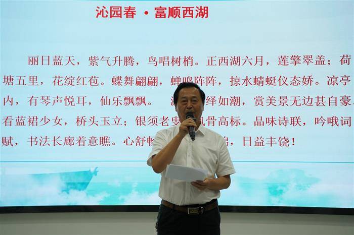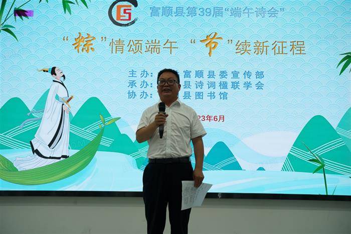 6月21日,富顺县第三批文化守望者颁奖大会暨第39届“端午诗会”在富顺县图书馆隆重举行。本次大会由富顺县委宣传部主办,富顺县诗词楹联学会承办,富顺县图书馆协办。富顺县委常委、统战部部长林映红,富顺县政府信息公开办主任宋希,县委宣传部副部长严玉等领导出席,县文广旅局副局长魏旭,《富顺文化守望者》书籍执行主编何安平等各部门领导,富顺县第三批文化守望者代表,富顺县诗词楹联学会部分会员和其他各协学会代表共80余人参加。