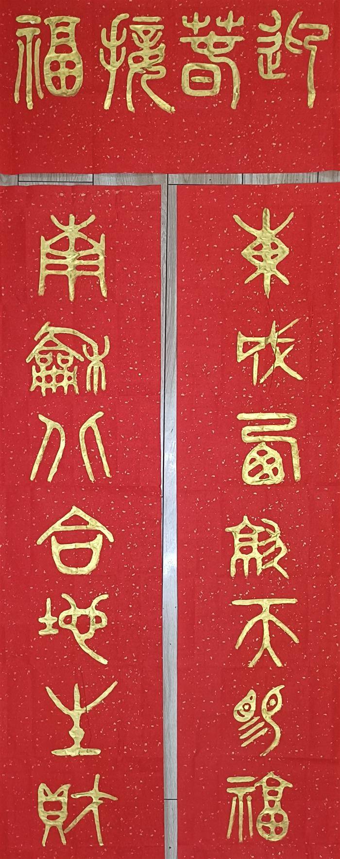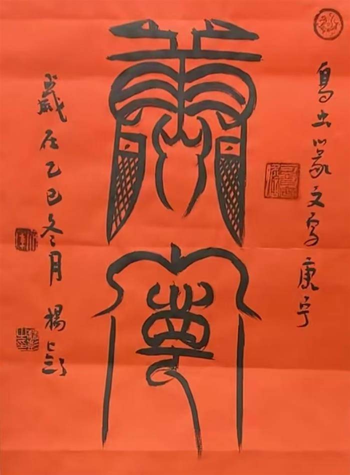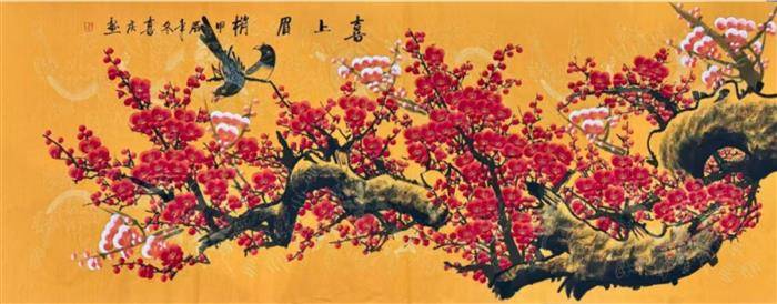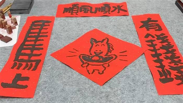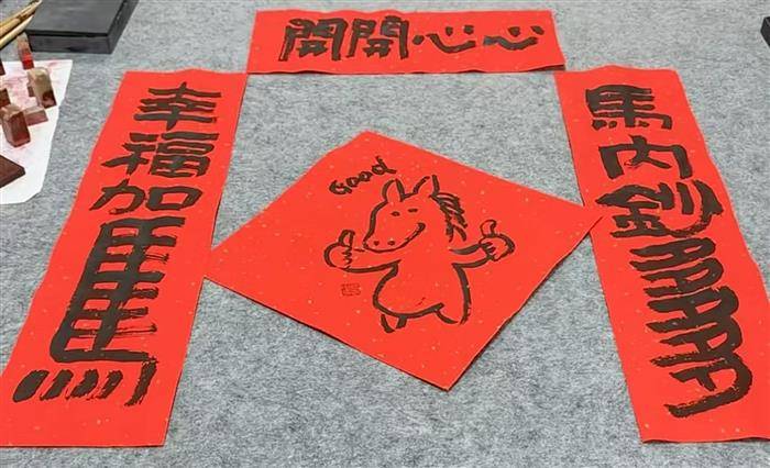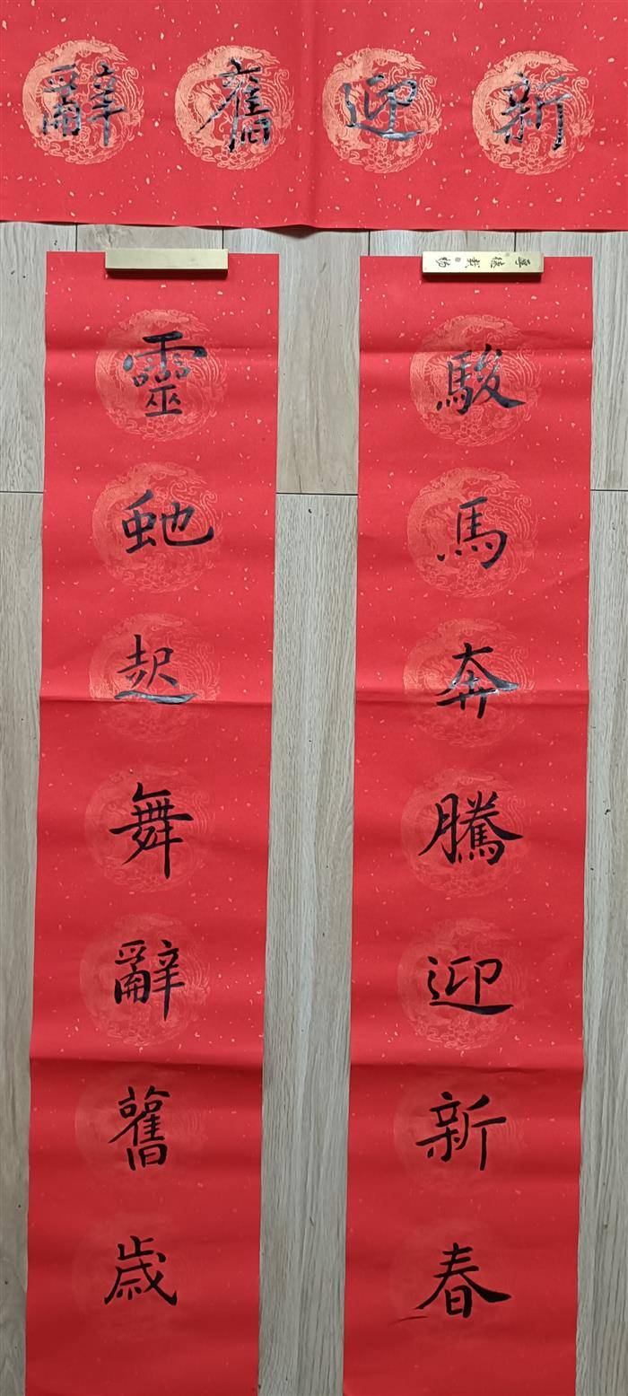 值此佳期,谨以两联再表心志,并贺新禧:砚池春暖,笔带烟霞书锦绣。墨海潮平,文腾龙马振云天。旧岁蛇盘,韵琢珠玑光史册;新年马跃,章开气象壮山河。