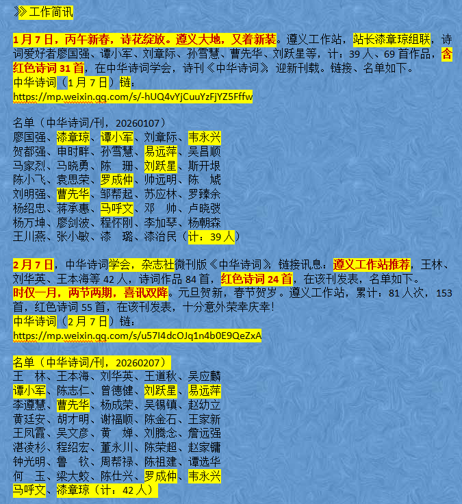 2月4日,会员遵9中教师刘腾会,诗词作品集筹备座谈会,在遵义南城众人熙熙进行。参加人员有:孙光静、张桂珍、吴朝忠、韩富珍、顾晓璞、刘腾念、漆章瓊等。