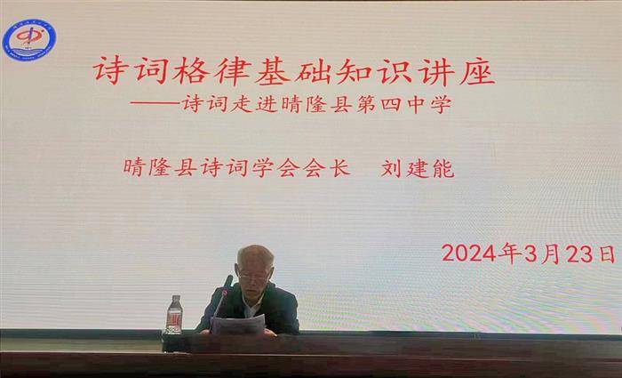 县诗词学会会长刘建能向师生们作了《诗词格律基础知识》专题讲座。他从“诗词的发展历程”“格律诗的基本知识”和“格律诗的创作”三个方面进行分析,重点突出,条理清晰,深入浅出,富有激情,深受学生们喜爱。