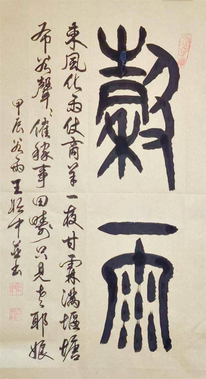 下联:春雷乍响小窗静,书写小字墨香暖,几笔灰影寥寥,似顽鱼戏荷归。
