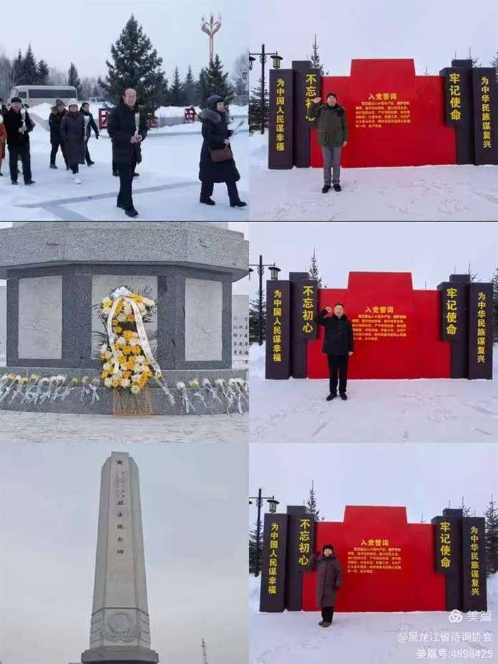 在加格达奇革命烈士陵园和松岭区库楚河战役抗联烈士纪念碑前,全体诗人在胥春丽会长的带领下向烈士纪念碑献花,采风的全体党员还在陈修文的带领下重温了入党誓词。