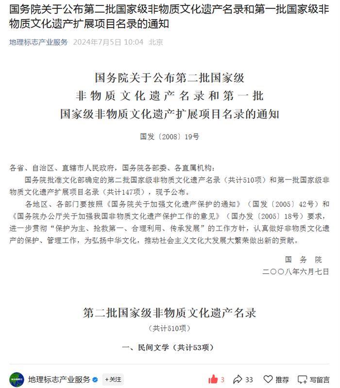 参考资料:国务院 / 第二批非遗 / 第 一 批扩展名录 / 国发〔2008〕19号
