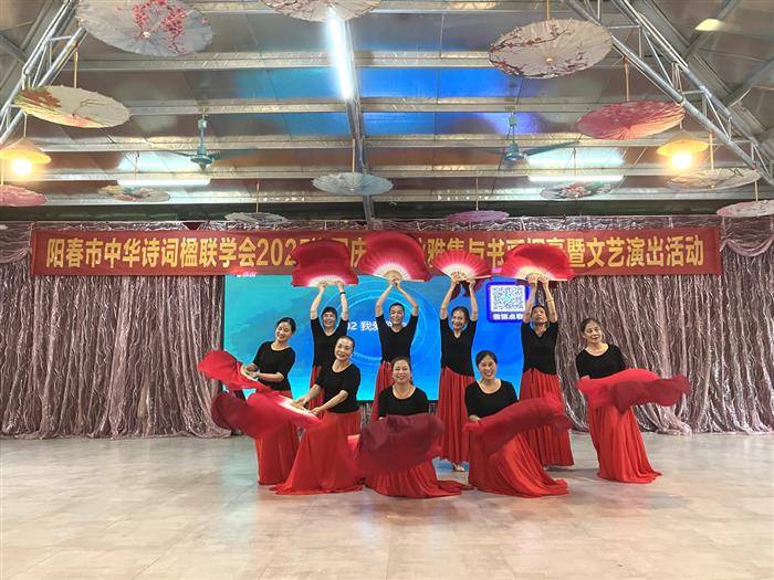 文艺演出环节,会员们自编自导自演的十多个节目接连呈现,满含诚意。激昂的大合唱《阳春市诗联学会会歌》拉开序幕;阳春诗联工会艺术团以舞蹈《我爱你中国》传递赤子之心;朱明英女士献唱《中国春常在》,歌声清亮温暖;阳春诗联炫舞舞蹈队、梅子舞蹈队、卓信舞蹈队、快乐舞蹈队、潇洒舞蹈队、吉祥舞蹈队,分别以《最后还是成为过客》《最美是你》《最美四季》《踏歌起舞的中国》《手心有你 眼里都是你》《太阳出来喜洋洋》展现多样风采,或抒情婉转,或活泼明快;张金凤、练月玲、赖美玲三人以家长、老师、孩子的视角,用诗歌朗诵讲述爱与教育的传承故事;阳春诗联合唱队一曲《走向复兴》饱含深情;陈华福、严少爱、黄世能弹唱《西沙,我的家乡》,勾勒宝岛美好图景;特邀嘉宾林良富以三首通俗的阳江白榄暖场,更带来《赞赞好人刘再全》,传递身边正能量;成瑞珍主席演唱粤曲《彩云追月》,唱腔婉转,赢得阵阵掌声。
