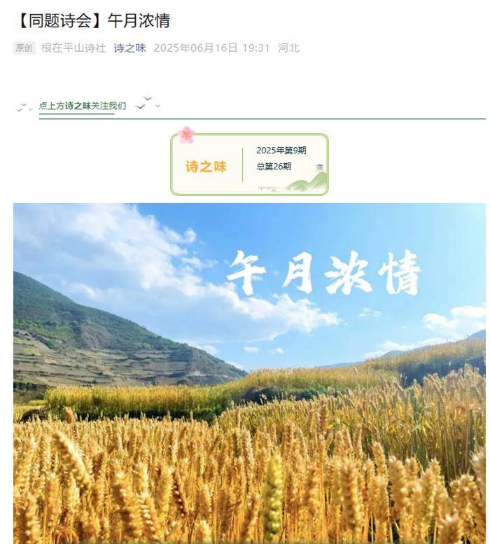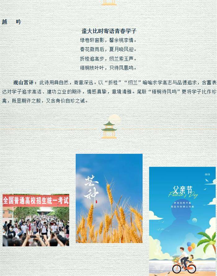 观山赏评:此诗于意象并置与时空双线交织方面颇有特点,将麦田即将丰收与学子即将升学考试的两种辉煌并列互喻。“薰风卷浪”与“青春飞翰”形成田野与校园、自然与人文的呼应,展现午月麦香与学子奋斗的双辉景象。情感昂扬向上,写作手法上虚实结合,富有层次感。