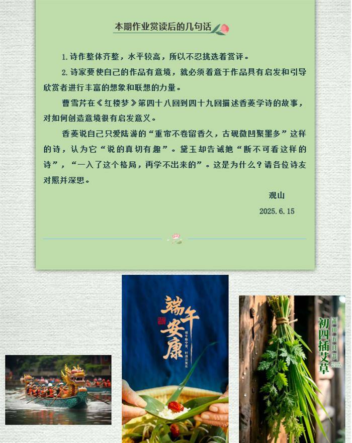 观山赏评:此诗借古抒怀,情感激越。以“菖蒲”“艾草”“角黍”勾连民俗,借“龙舟竞渡”“鼓角断魂”再现楚地遗风。通过“忠魂沉楚水”“九歌遗韵”等意象缅怀屈原,弘扬忠烈精神,意境壮阔,富有感染力。然用词稍显陈熟,略减新意。