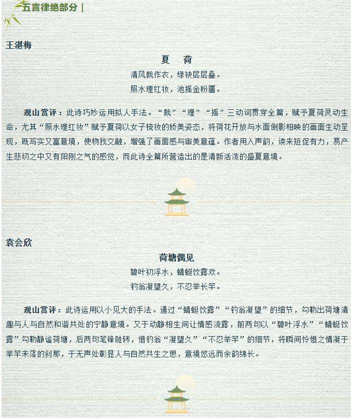 观山赏评:此诗意境清幽,富有画面感。熟练运用通感移情与虚实相生手法,以“圆荷裁衣”化静为动,赋予自然灵性。“圆荷裁作碧罗衣”又运用比喻与拟人手法,生动展现荷叶之美;“夜夜家山愈见肥”则以虚实结合,寄托对故乡的思念与眷恋。整体语言凝练,情感含蓄。