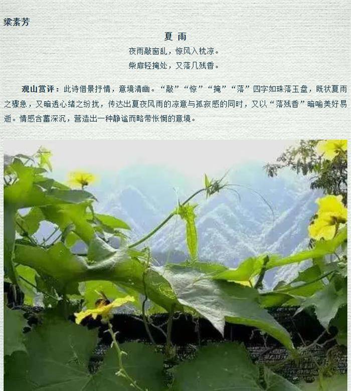 观山赏评:此诗画面生动,情感纯真。“翻飞素袂”“瓢虫点点”勾勒出夏日童趣的灵动画面,意境明快,富有生活气息。写作手法上以白描为主,语言简洁清新,在童趣捕捉与色彩渲染上颇具特色。然内容较为浅显。