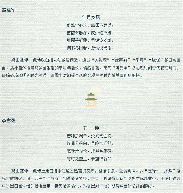 观山赏评:此词意境清新,情景交融。通过“好雨知心”“戴月荷锄”“穿花扶杖”等意象,赋予自然灵性,形成劳作与闲适的张力,展现芒种时节田园生活的宁静与劳作之美,情感质朴自然,流露出对乡土生活的热爱。结句“熟麦俏畦田”以“俏”字点活丰收图景。语言明快,画面感强。