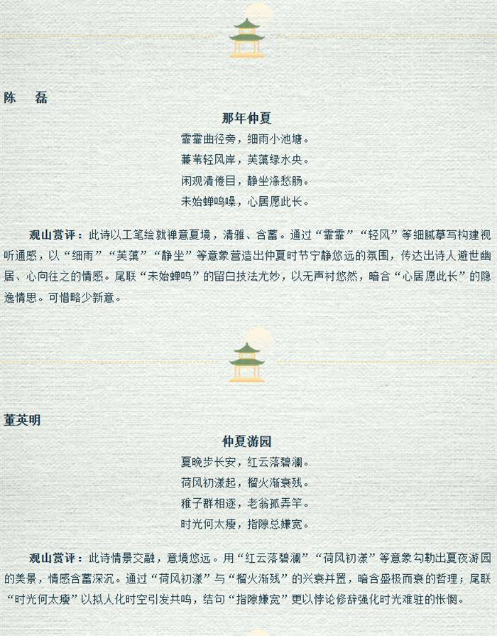 观山赏评:此诗意境清新,情感闲适,展现夏日田园静美之景。“榴花灼灼”“金色田间”色彩鲜明,画面感强。“叶底青蛙鸣鼓乐”以动衬静的灵动,与榴花映檐的视觉璀璨相映成趣,增强诗意层次,体现自然和谐之美,富有田园情趣。