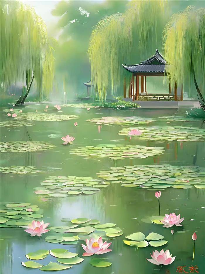 岸柳腾烟,一湖春色一湖画;
