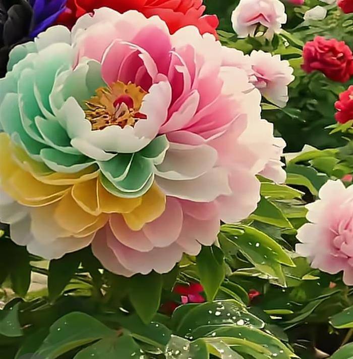首句“国色天香花海园”直接化用“国色天香”这一经典成语,点明牡丹在百花中的崇高地位。将牡丹置于“花海园”的宏大背景中,既显其众芳簇拥的王者之气,又为后文铺陈氛围。