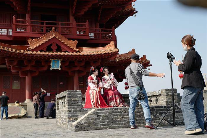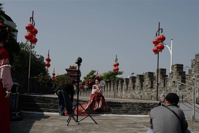 美少女在宋城墙上拍照