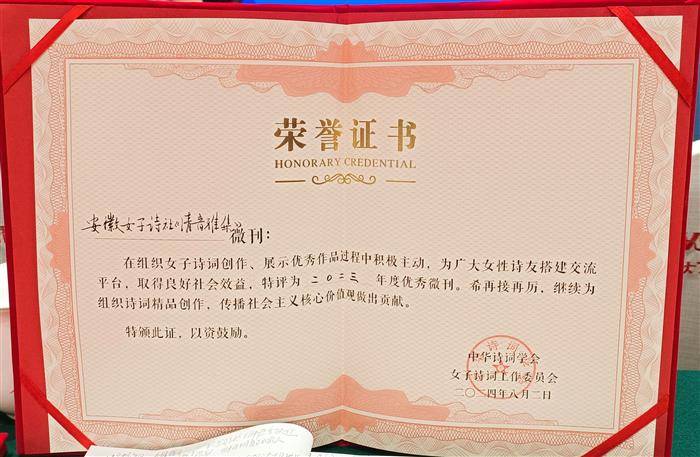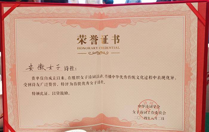 安徽省诗词协会女工委暨《清音雅集》微刊荣获中华诗词学会女工委表彰