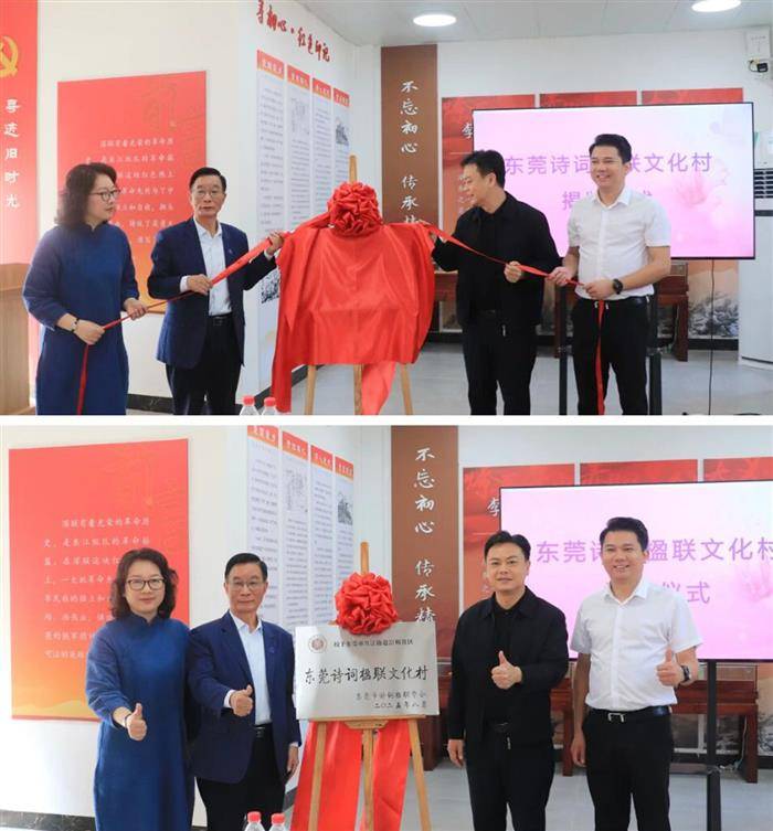 在热烈的掌声中,万江街道党工委委员陈浩荣、东莞市诗词楹联学会会长吕文彬、万江街道文联常务副主席张莹、滘联社区党委书记叶华柱共同揭下红绸,“东莞诗词楹联文化村”的牌匾在灯光下熠熠生辉。这标志着东莞市首个“诗词楹联村”的诞生。