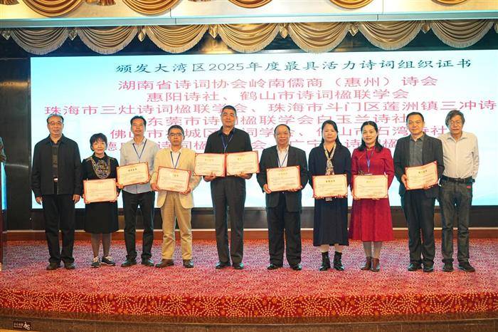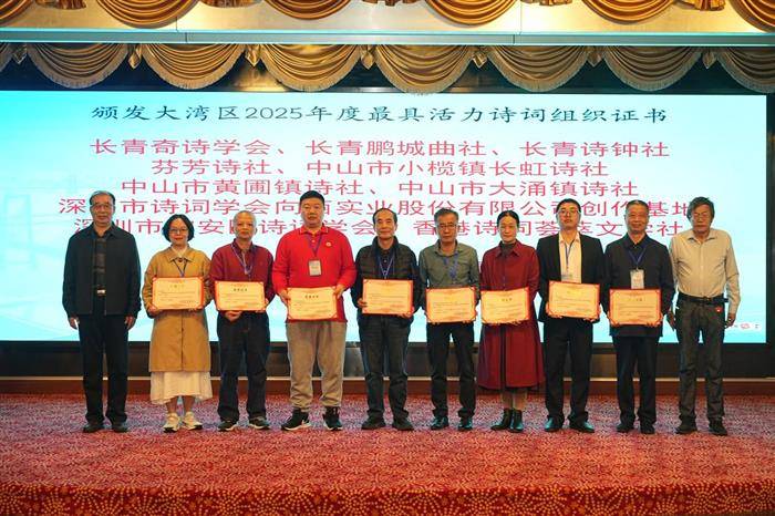 12月12日的颁奖仪式上,主办方为大湾区诗词工委受聘人员颁发聘书,并评选表彰了大湾区2025年度的最具活力诗词组织、诗词评论突出贡献奖、诗词活动突出贡献奖等三类荣誉。
