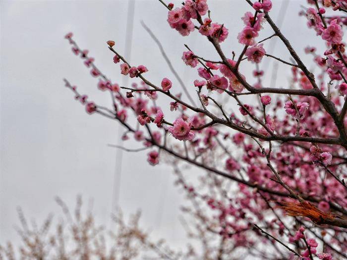 粉梅寒绽屹操场,笑语声盈逐暖阳。