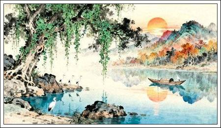 古木垂藤遮翠影,轻舟漾水送斜阳。