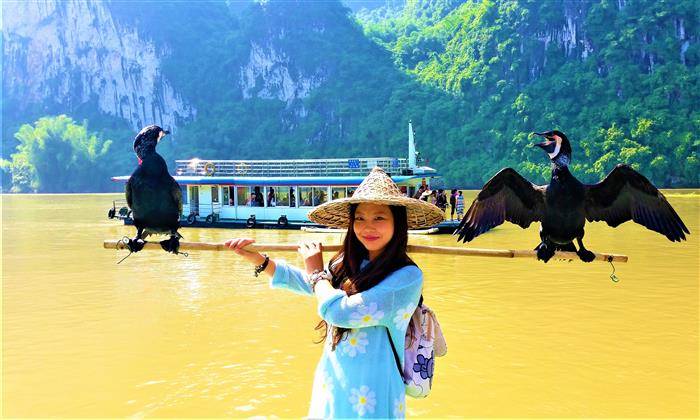 漓江两岸岫葱青,竹篙横担伴鱼鹰。