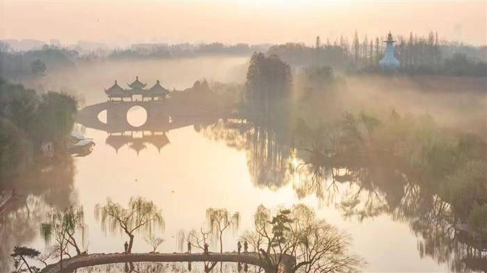 轻烟缭绕五亭桥,潋滟霞光水面摇。