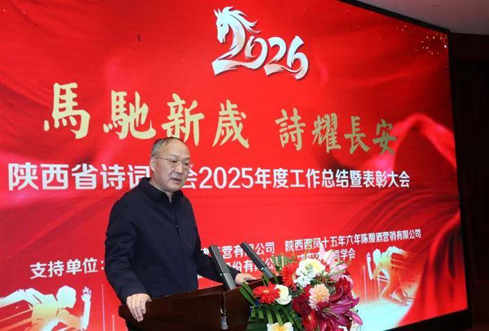 1月18日上午,“马驰新岁 诗耀长安”——陕西省诗词学会2025年度工作总结暨表彰大会在西北大学宾馆圆满举行。陕西省文学艺术界联合会党组成员、专职副主席蔺雨,中华诗词学会顾问、陕西省诗词学会名誉会长孟建国,中华诗词学会顾问、中华诗词学会散曲工委主任徐耿华,陕西省诗词学会会长、西北大学教授刘炜评,陕西省诗词学会顾问、西安外事学院理事长黄藤出席大会。陕西省诗词学会副会长李稳贤、李晓刚、王秦香、王彦龙、刘尚海、胡宝玲、郭健、许晓春、余志海、李永刚、段云飞、毛艳飞,顾问胡安顺、张伯利、张曼利、孙民随、王兴一、周晓陆,着名朗诵家包志坚、凌江,以及全省各地市学会会长、各区县获奖诗词学会代表和先进工作者、省诗词学会各部门负责人、会员代表和诗友代表等150余人齐聚一堂,共同感受2025年工作成效,谋划2026年发展思路。会议由陕西省诗词学会副会长兼秘书长马瑀主持。
