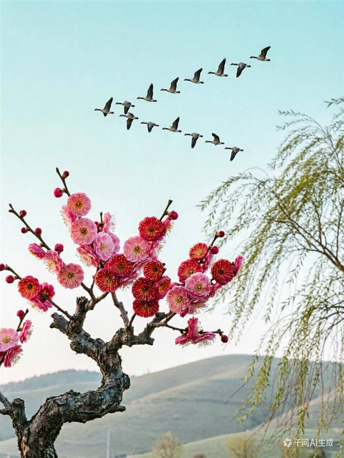 北回雁阵掠长空,吹面徐徐烟柳风。更有径前梅一树,虬枝破蕊胜霞红。